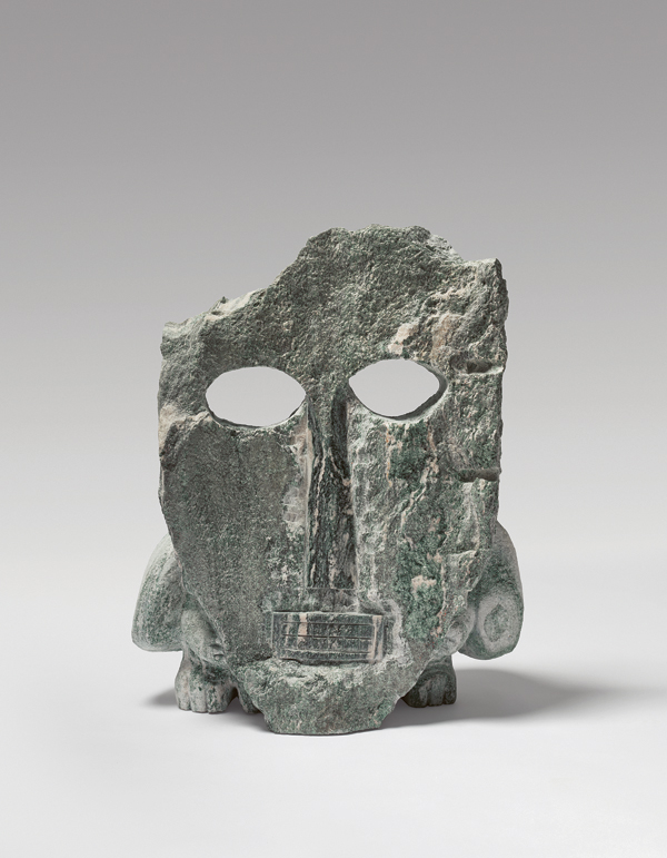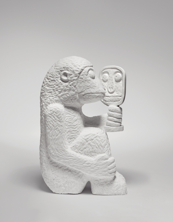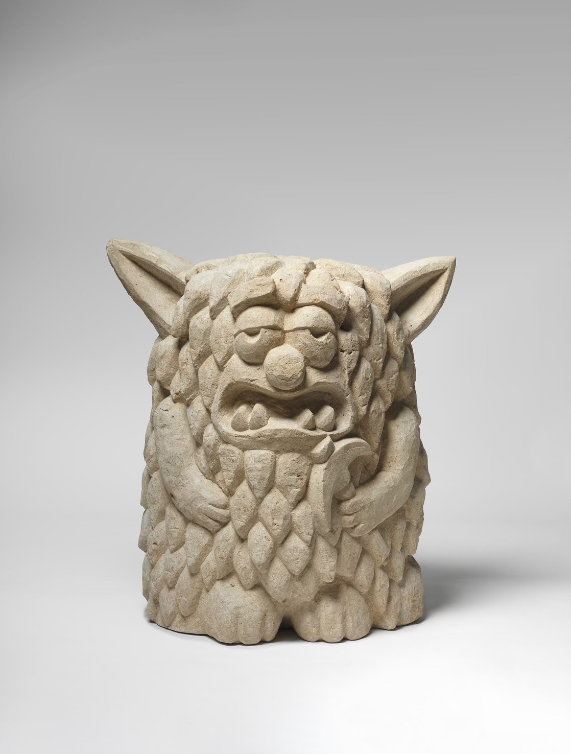 Was auch immer hier vorgeht, so hat es den Eindruck, als wolle Stefan Rinck uns mit seinem Alpen-Clan den Spiegel vorhalten. Da ist beispielsweise auch die Figur der Percht, die in den sogenannten „Raunächten“ zwischen dem 24. Dezember und dem 6. Januar, also zwischen Heiligabend und Heilige Drei Könige, jedes Jahr in den bayerischen Alpen ihr Unwesen treibt und in den Bergdörfern als Verkörperung des Bösen unsere Urängste wecken will und uns genauso in Schrecken versetzt wie die verwandte männliche Figur des Krampus. Stefan Rinck stellt sie als schwarze, unförmige Masse aus hochpoliertem belgischem Blaustein dar, aus deren blinden Augenhöhlen nichts Gutes zu uns spricht. In der Gruppe finden sich aber auch verschiedenste kleinfigurige, zottige Trolle, die sich ohne Scheu auf dem fremden Terrain der Pinakothek der Moderne bewegen, so als wären sie hier zu Hause. Und damit sind wir auch schon beim Wunschziel dieses Mummenschanzes angelangt. Wie das Mammut, das einst die kalten Regionen unserer Landschaft bevölkerte, haben sich auch einzelne blaugraue Regentropfen dem Zug angeschlossen, um, so könnte man sie deuten, auf die Misere hinzuweisen, dass die Alpenregion aufgrund der immer größer werdenden Wasserknappheit und dem andauernden Mangel an Schnee zukünftig nicht mehr zu ihrem Siedlungsgebiet zählen wird. Offensichtlich stellt der Alpen-Clan plötzlich in der Rotunde der Pinakothek der Moderne vieles zur Diskussion und die Besucher sind eingeladen, daran teilzunehmen.