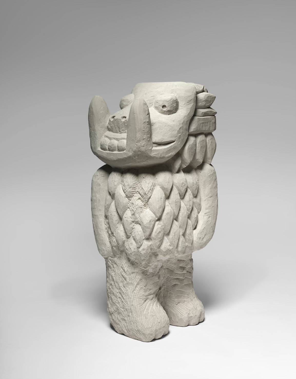 This publication accompanies Rinck’s solo exhibition at the Pinakothek der Moderne, the first of three projects in the Rotunda curated by the Staatliche Graphische Sammlung München from late 2025. The catalogue brings together key sculptures created by the artist over the past decade, offering an overview of his distinctive development. It also documents a mighty crescendo, with more than thirty new sculptures entering the Pinakothek under the title Der Alpen-Clan kehrt zurück (The Return of the Alpine Clan). Nonchalantly evoking a Bavarian way of life, they offer a fresh take on traditions, such as customs, superstitions, and festivities, but also pride in this heritage. In the site-specific installation, Rinck’s latest cast of characters humorously questions regional cultural practices, appropriating and reinterpreting them. With a trace of mischief that recalls the medieval culture of upending hierarchical structures on certain feast days – a culture that survives in rudimentary form in Bavarian carnival – he proposes an alternative to the existing order. This reflects a subtle artistic strategy that prefers to discuss complex issues rather than offering one-dimensional answers.