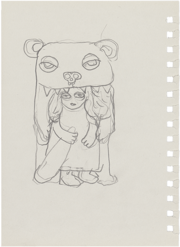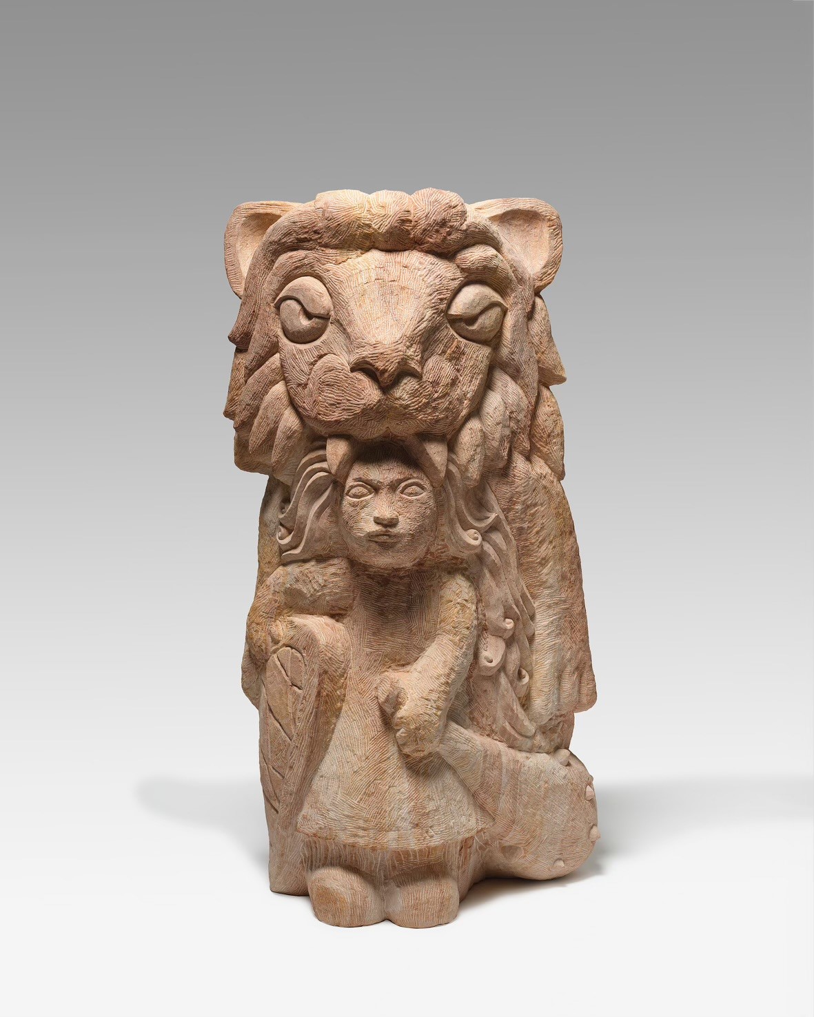 What is the idea behind the deliberately sensational title of Rinck’s installation for the Pinakothek der Moderne? Our eyes are immediately drawn to the sculpture at the center of the group – a small girl thronged by an entourage of multifarious figures. Looking straight ahead, she appears resolute, an impression reinforced by the archaic club she is carrying and her shield bearing the Bavarian state’s heraldic pattern of blue and white lozenges. As if these insignia were not enough, she is also cloaked in a lion skin, like a shaman, while her head is crowned by its awe-inspiring, supersized skull – an obvious reference to Bavaria’s heraldic beast. Whatever epoch she comes from, it is clear that she is the spiritual leader of the Alpine Clan. For Rinck, it is not enough here to naively stir up muchdiscussed gender roles. Instead, he reaches into the storehouse of political iconography and clothes his heroine in elements that quote the classical dress code of the mythological hero Hercules, whose garb is now more usually associated with clichéd dreams of masculine omnipotence.