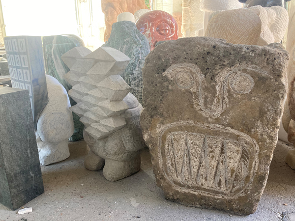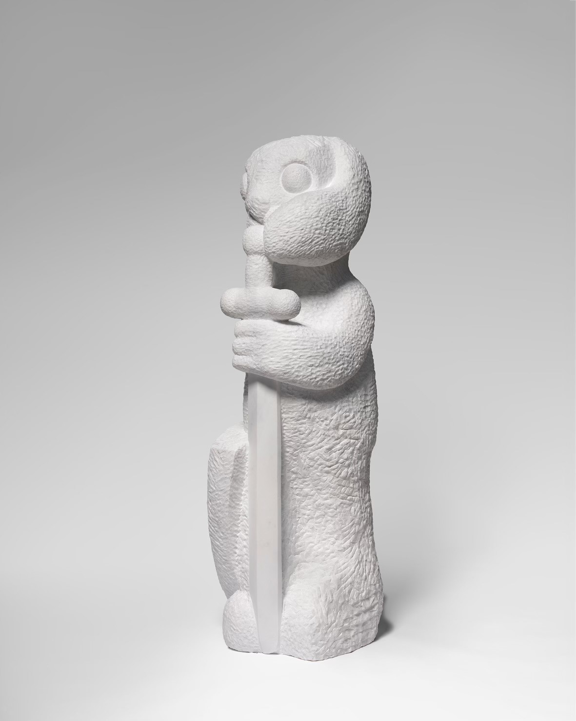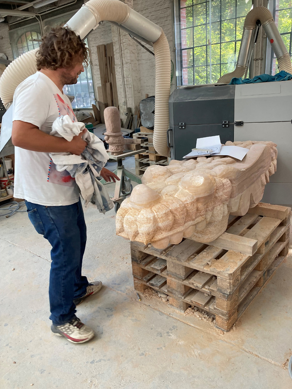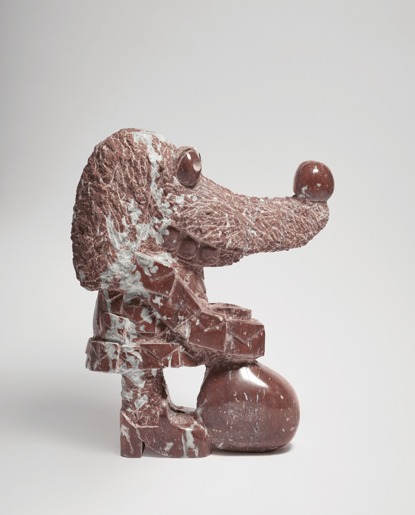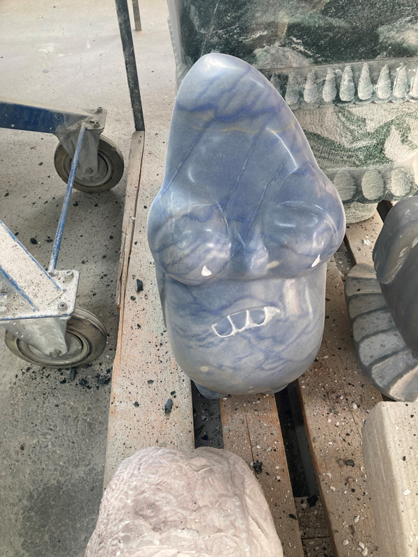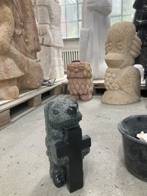 In his hands, rough rocks grow into unknown sublime creatures. When choosing which type of stone to use, he bears in mind the specific methods of working each material, in order to do justice to the allure of the future sculpture. With the stonemason’s expertise, his eye may jump from a more brittle, clay-colored Elbe sandstone to the hard brightness of a blue Macaubas or green Atlantis quartzite, before unexpectedly considering a block of snow-white statuary marble, the nonplus ultra of classical sculpture, for his next folie. The material mix of his sculpture park summons a motley crew of shimmering spirits into which he breathes life. With their often overdrawn features, they recall Picasso’s extraterrestrial acrobats of the blue and rose periods. Like them, Rinck’s statues inhabit our world without sharing our reality. Which is what makes them so appealing. We are touched by the strangeness of their fairy-tale habitat which, viewed close up while maintaining a safe distance, is not dissimilar to our own human nature with all its desires and anxieties.